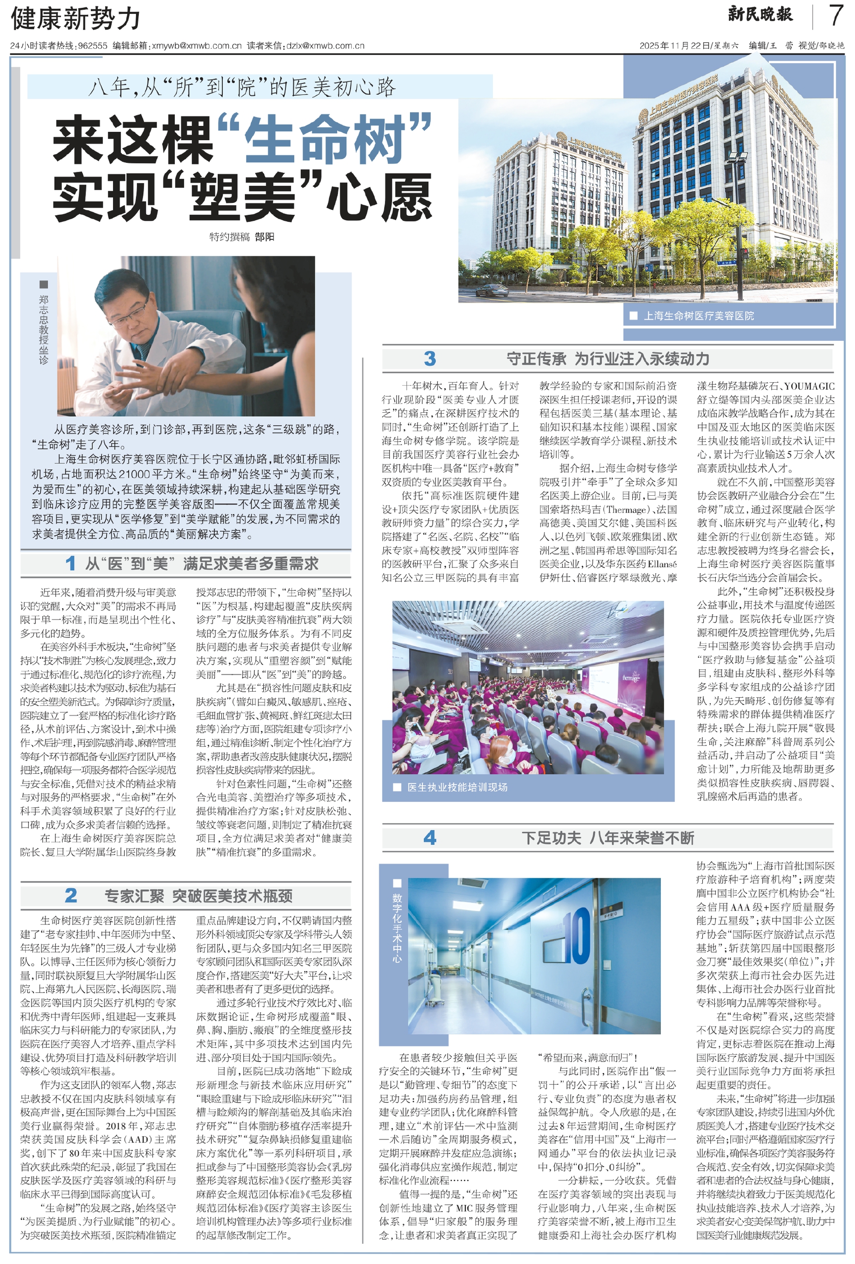 在上海生命树医疗美容医院总院长、复旦大学附属华山医院终身教授郑志忠的带领下,“生命树”坚持以“医”为根基,构建起覆盖“皮肤疾病诊疗”与“皮肤美容精准抗衰”两大领域的全方位服务体系。为有不同皮肤问题的患者与求美者提供专业解决方案,实现从“重塑容颜”到“赋能美丽”——即从“医”到“美”的跨越。
