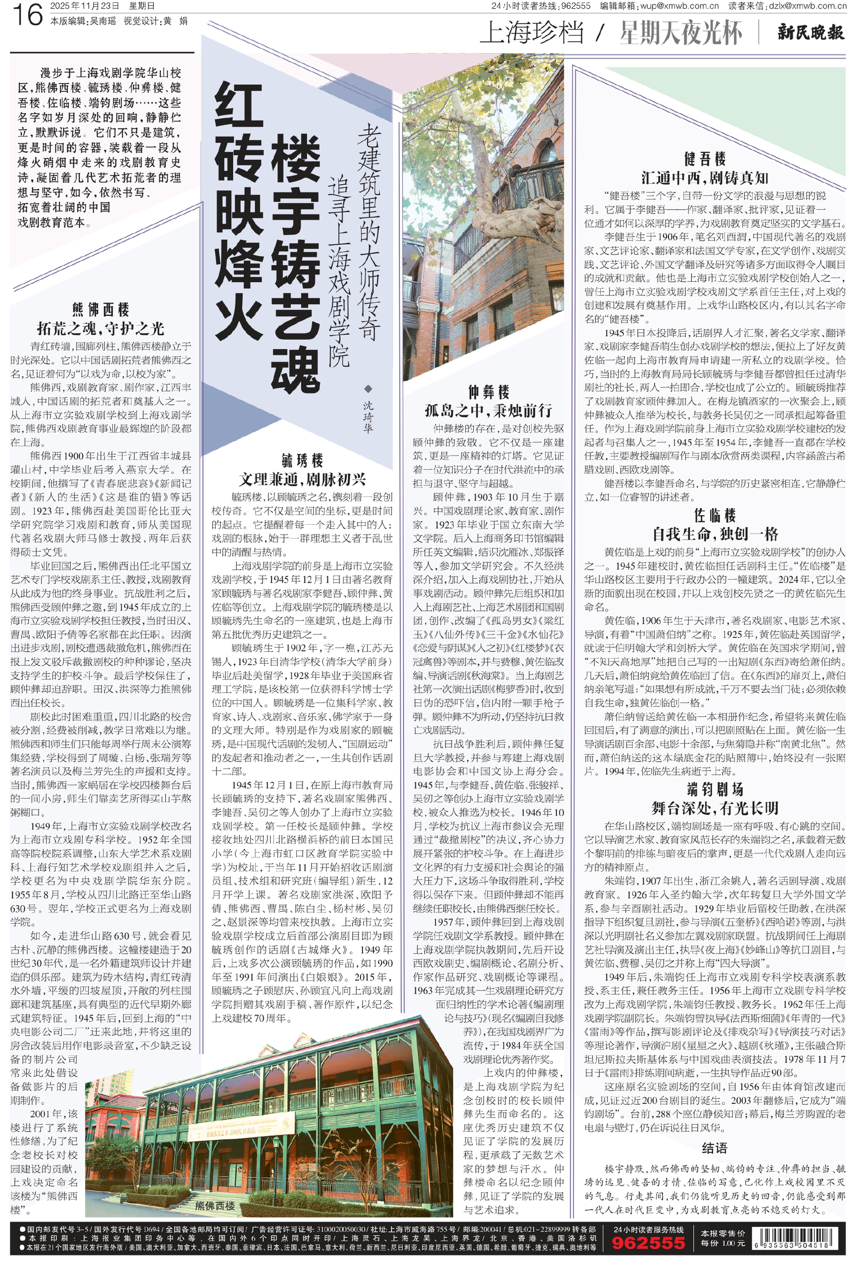 漫步于上海戏剧学院华山校区,熊佛西楼、毓琇楼、仲彝楼、健吾楼、佐临楼、端钧剧场……这些名字如岁月深处的回响,静静伫立,默默诉说。它们不只是建筑,更是时间的容器,装载着一段从烽火硝烟中走来的戏剧教育史诗,凝固着几代艺术拓荒者的理想与坚守,如今,依然书写、拓宽着壮阔的中国戏剧教育范本。