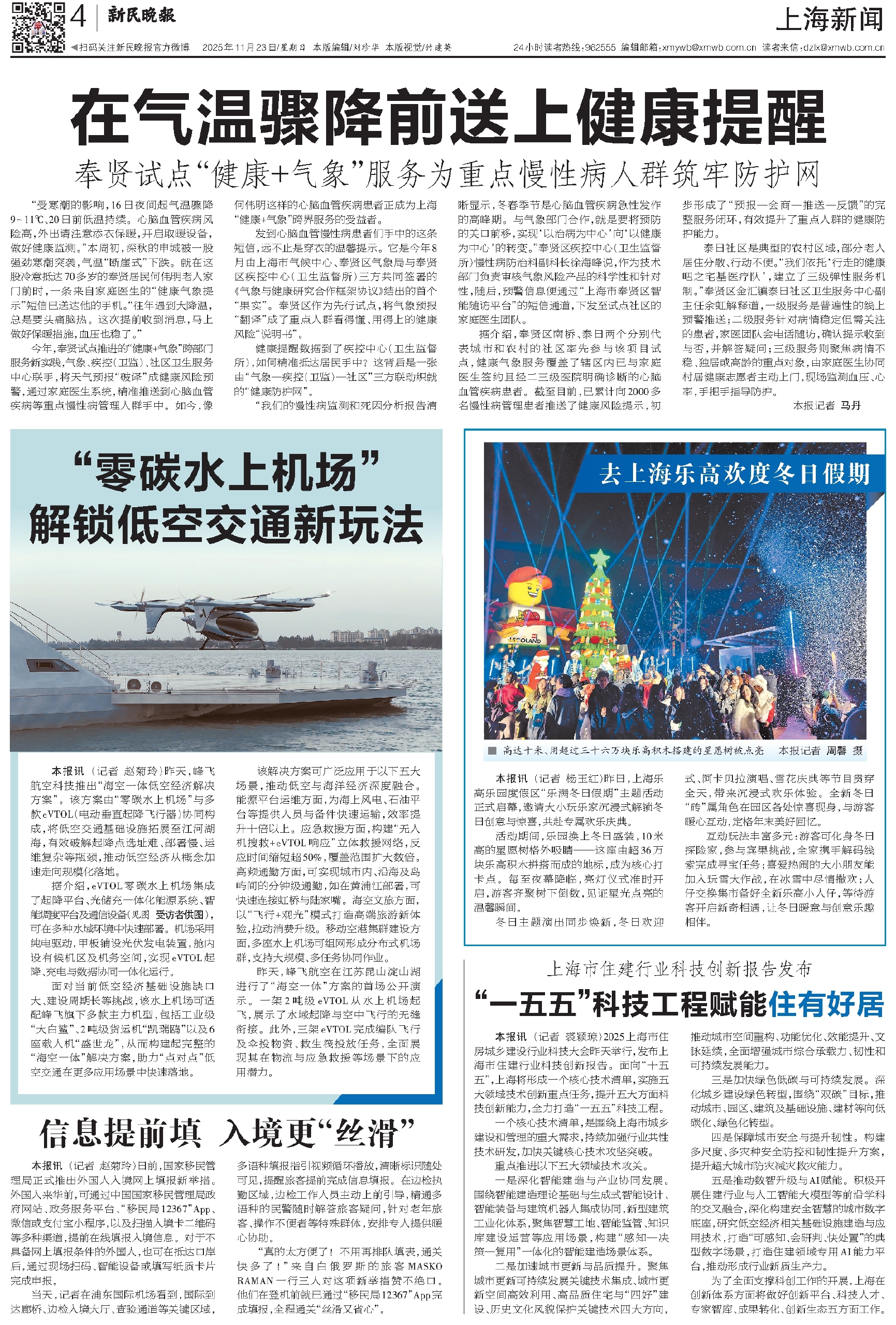 “受寒潮的影响,16日夜间起气温骤降9~11℃、20日前低温持续。心脑血管疾病风险高,外出请注意添衣保暖,开启取暖设备,做好健康监测。”本周初,深秋的申城被一股强劲寒潮突袭,气温“断崖式”下跌。就在这股冷意抵达70多岁的奉贤居民何伟明老人家门前时,一条来自家庭医生的“健康气象提示”短信已送达他的手机。“往年遇到大降温,总是要头痛脑热。这次提前收到消息,马上做好保暖措施,血压也稳了。”