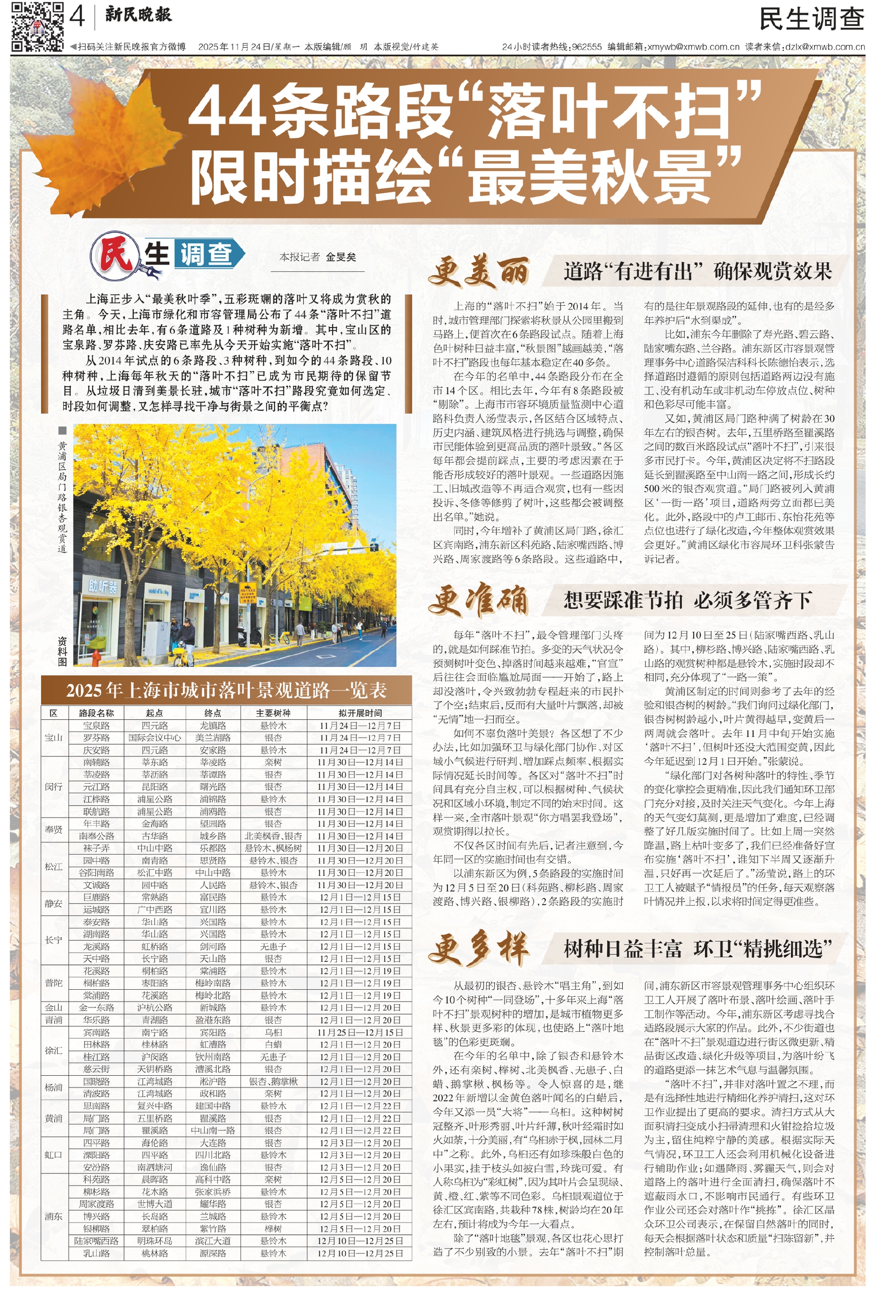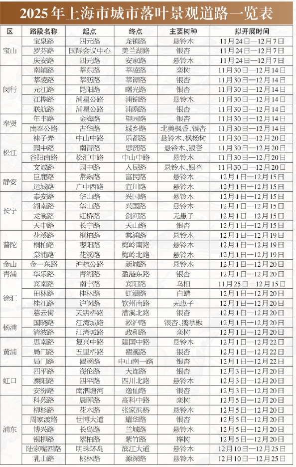 在今年的名单中,44条路段分布在全市14个区。相比去年,今年有8条路段被“剔除”。上海市市容环境质量监测中心道路科负责人汤莹表示,各区结合区域特点、历史内涵、建筑风格进行挑选与调整,确保市民能体验到更高品质的落叶景致。“各区每年都会提前踩点,主要的考虑因素在于能否形成较好的落叶景观。一些道路因施工、旧城改造等不再适合观赏,也有一些因投诉、冬修等修剪了树叶,这些都会被调整出名单。”她说。