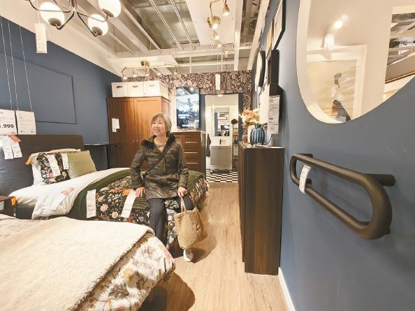 宜家中国在第八届进博会上展出的适老系列家居场景,近日亮相沪上4家线下门店。其围绕银发族的烹饪洗漱、日常起居、放松休憩等长者需求,承接进博会溢出效应,赋能居家养老新体验。图为长辈卧室解决方案提供合理动线和适老扶手等细节设计 本报记者 刘歆 摄影报道