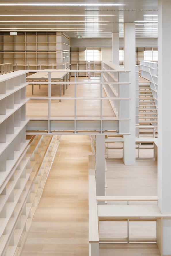 图书馆由日本建筑师坂本一成设计,从设计到实现历时十年。建筑师发展了拓扑学中对连续性的思考,将阅读转化为一场连续而沉浸的漫游。书架被巧妙地置入一条缓缓升起的坡道之中,读者可以循着这条迂回上升的路径,自由穿梭于不同的书籍之中。行走与思考、身体与心灵,在坡面与弯折之间融合成新的感官体验。目前,只有五分之一的书架被填满。
