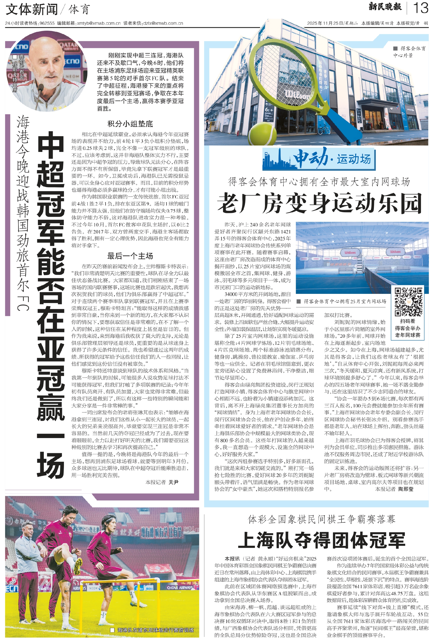 刚刚实现中超三连冠,海港队还来不及歇口气,今晚6时,他们将在主场浦东足球场迎来亚冠精英联赛第5轮的对手首尔FC队。结束了中超征程,海港接下来的重点将完全转移到亚冠赛场,争取在本年度最后一个主场,赢得本赛季亚冠首胜。