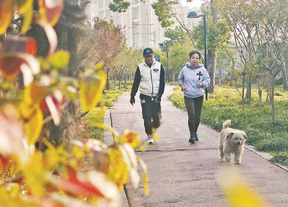 ③ 在金山区临桂路的小公园内,晨练的市民身着厚实衣物锻炼 本报记者 陶磊 摄