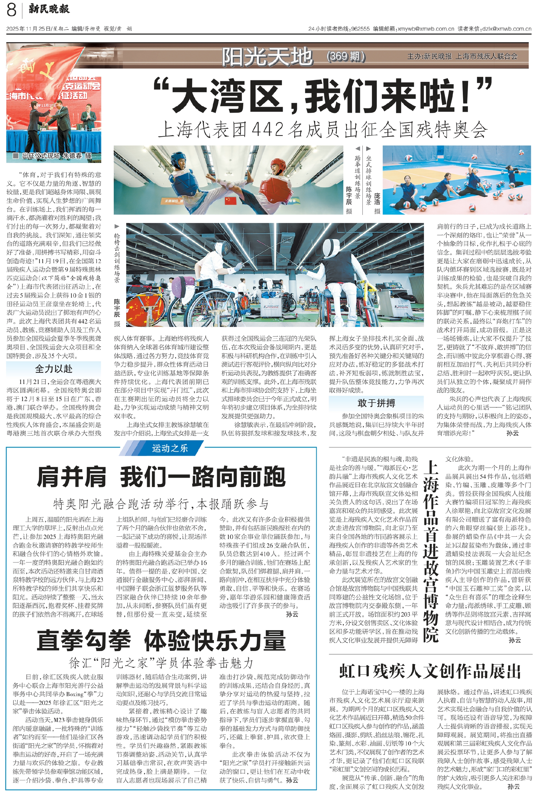 “体育,对于我们有特殊的意义。它不仅是力量的角逐、智慧的较量,更是我们超越身体局限、展现生命价值、实现人生梦想的广阔舞台。在训练场上,我们挥洒的每一滴汗水,都浇灌着对胜利的渴望;我们付出的每一次努力,都凝聚着对自我的挑战。我们深知,通往领奖台的道路充满艰辛,但我们已经做好了准备,用拼搏书写精彩,用奋斗创造奇迹!”11月19日,在全国第12届残疾人运动会暨第9届特殊奥林匹克运动会(以下简称“全国残特奥会”)上海市代表团出征活动上,在过去5届残运会上获得10金1银的田径运动员王彦章坐在轮椅上,代表广大运动员说出了掷地有声的心声。此次上海代表团共有442名运动员、教练、竞赛辅助人员及工作人员参加全国残运会夏季冬季残奥聋奥项目、全国残运会大众项目和全国特奥会,涉及35个大项。