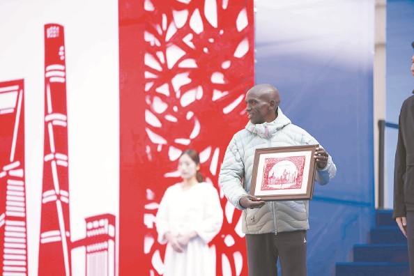 昨天的赛前发布会上,两届马拉松奥运会冠军、原世界纪录保持者、11座马拉松大满贯冠军获得者基普乔格惊喜亮相。为上马跑者加油助威,他向上马组委会赠送了一双全新的基普乔格系列跑鞋,组委会向基普乔格送上了一幅融合中国传统剪纸技艺与现代体育精神的艺术作品。