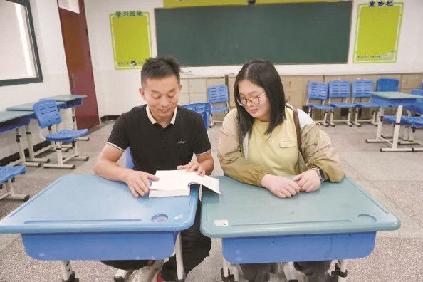 去年秋季开学,蔡家父女俩成了同一所大学的同学。周末,他们常常一起去学校上课;下课后,两人会并肩漫步在美丽的校园,然后一起去食堂吃饭,有时蔡海林请客,有时女儿买单,惹得其他同学纷纷投来羡慕的眼光。虽然父女俩专业不同,但有几门公共课是一样的,可以坐在同一间教室听课。有一次,女儿做办公自动化作业时遇到了难题,蔡海林在一旁耐心指导,帮她顺利解决了问题,女儿一下子脱口而出:“老爸你真厉害!”蔡海林说,这时他的心里别提有多温暖了。
