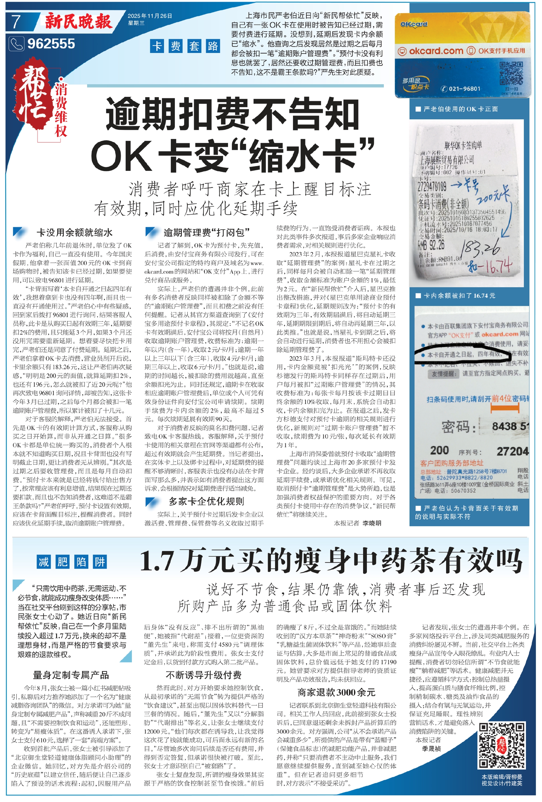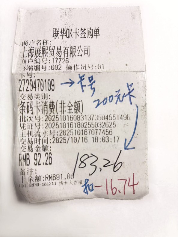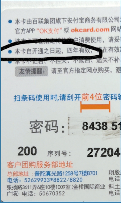 “卡背面写着‘本卡自开通之日起四年有效’,我想着拿到卡也没有四年啊,而且也一直没有开通使用过。”严老伯心中有些疑惑,回到家后拨打96801进行询问,结果客服人员称,此卡是从购买日起有效期三年,延期要扣2%的费用,且只能延3个月,如果3个月还没用完需要重新延期。想着要尽快把卡用完,严老伯还是同意了付费延期。延期之后,严老伯拿着OK卡去消费,营业员刮开后说,卡里余额只有183.26元,这让严老伯再次疑惑,“明明是200元的面值,就算延期扣2%,也还有196元,怎么就被扣了近20元呢?”他再次致电96801询问详情,却被告知,这张卡今年3月已过期,之后每个月都会被扣一笔逾期账户管理费,所以累计被扣了十几元。