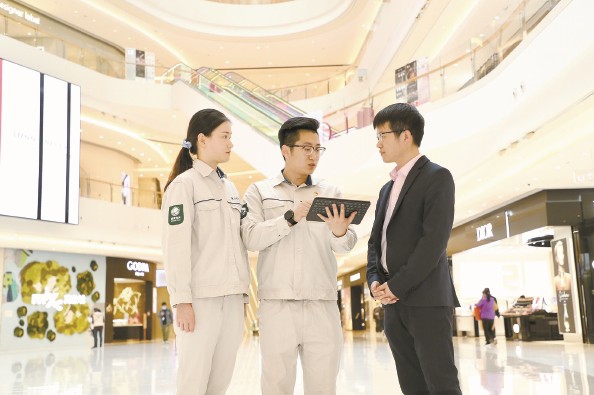 国网上海电力工作人员在闵行区万象城购物中心对商业楼宇用能优化系统项目进行沟通确认