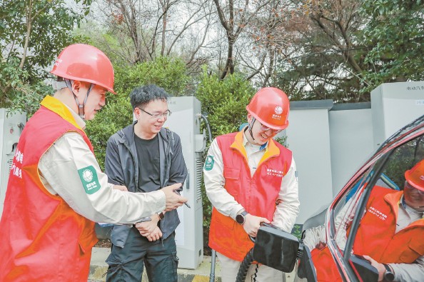 国网上海电力工作人员在三汇路充电站向用户介绍参与车网互动V2G反向送电享补贴的服务政策