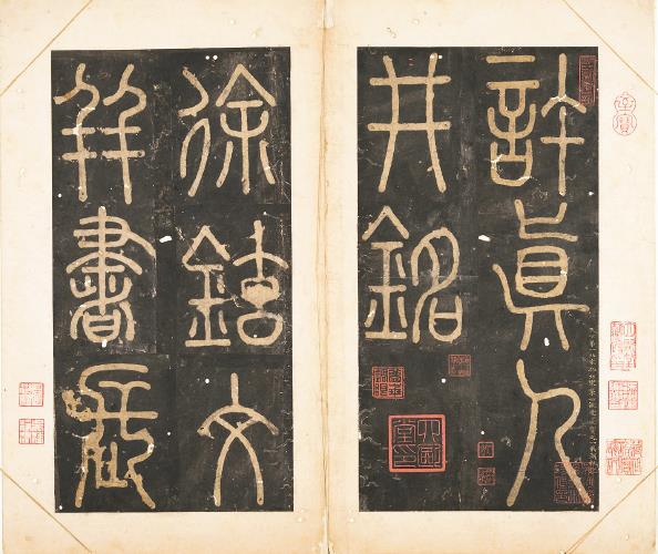 由于本次年展展品数量众多,部分展品也会在新年元旦之际隆重焕新。届时会上线一批重量级藏品,其中就有潘祖荫旧藏海内孤本宋拓《许真人井铭》。许真人,即道教上清派的创始人许谧,相传其在茅山紫阳观修行,最后得道飞升。六百多年后,文学家、书法家徐铉途经茅山,在许谧故居访得古井,感怀之下题刻井铭,这便是《许真人井铭》。徐铉尤为擅长篆籀,取法李斯、李阳冰,这篇《许真人井铭》是其存世为数不多的书法作品之一。此册中有张廷济、吴湖帆、潘静淑、钱坫等题记题跋数则,另有陈广甯、钱泳、陈豫锺、冯敏昌、潘学敏、何元锡、倪稻孙、徐楙、陈承修、褚德彝、蒋祖诒、吴梅、叶恭绰等多人观款。吴湖帆将此册誉为“天下第一北宋拓北宋装”,不只版本珍罕,而且其装帧手段为目前所见之孤例。宋装内页被逐页固定在了新制的经折底册之上,中心对折处和四角分别加了金色的丝线固定。既保留了宋装原貌,又有加固和装饰的作用,使这册拓本变得厚重而富丽。
