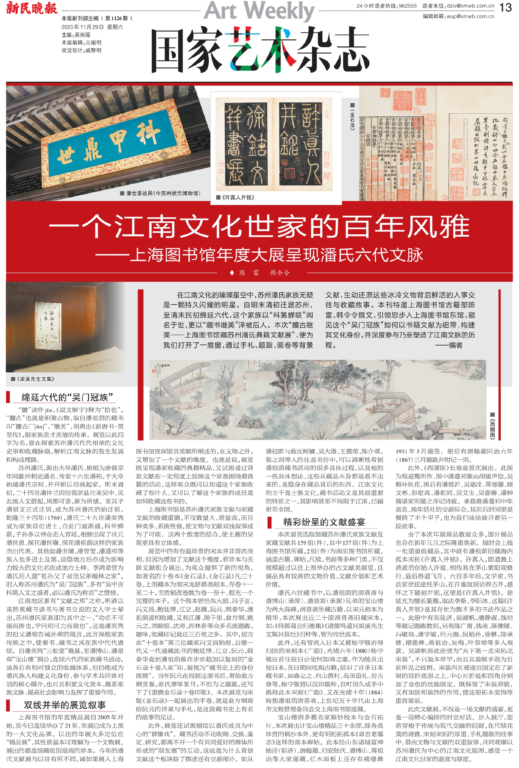 在江南文化的璀璨星空中,苏州潘氏家族无疑是一颗持久闪耀的明星。自明末清初迁居苏州,至清末民初绵延六代,这个家族以“科第蝉联”闻名于世,更以“藏书继美”泽被后人。本次“攟古继美——上海图书馆藏苏州潘氏典籍文献展”,便为我们打开了一扇窗,通过手札、题跋、画卷等背景文献,生动还原这些冰冷文物背后鲜活的人事交往与收藏故事。本刊特邀上海图书馆古籍部陈雷、韩令令撰文,引领您步入上海图书馆东馆,窥见这个“吴门冠族”如何以书籍文献为纽带,构建其文化身份,并深度参与乃至塑造了江南文脉的历程。 ——编者