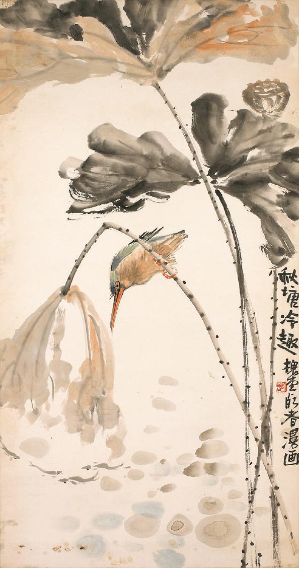 陈衡恪的《秋塘冷趣图》纵87.5厘米、横46.5厘米,纸本设色,右下方题有“荷塘冷趣”画名及“槐堂朽者漫画”题跋,钤“师曾”朱文印。画面构图简练,四枝荷梗交错出水,高低错落:三枝亭亭玉立,一枝弯曲垂伏。最长的荷梗上,一片宽大荷叶虽仅露半幅,却奋力舒展,宛若荷塘伸出的臂膀,以满腔热忱拥抱自然与秋日诗意;略矮的一枝荷梗上,荷叶已然破裂,暗合岁月沧桑;另一枝顶端的莲蓬虽在季节交替中日渐萎缩,莲子尖却清晰可见,朝天而立,昭示着生命的律动;还有一枝从上部弯折却未断裂,硕大的荷叶如收拢的伞,深情伏向水面。荷叶下方,几条游鱼自在嬉戏,仿佛回应着荷叶的依恋。作者特意在这枝将断的荷梗上绘一只栖息的水鸟:尖利爪子紧抓荷梗,翅膀收敛,尖嘴紧闭,双目圆睁,注视着水里的游鱼——似羡慕鱼儿的无拘无束,又似伺机而动,静待捕食良机。水面散布的小荷叶,宛若灵动的音符,暗合李商隐“秋阴不散霜飞晚,留得枯荷听雨声”的意象。整幅画虚实相生、意境深远,层次分明且富有力度,极具艺术感染力。