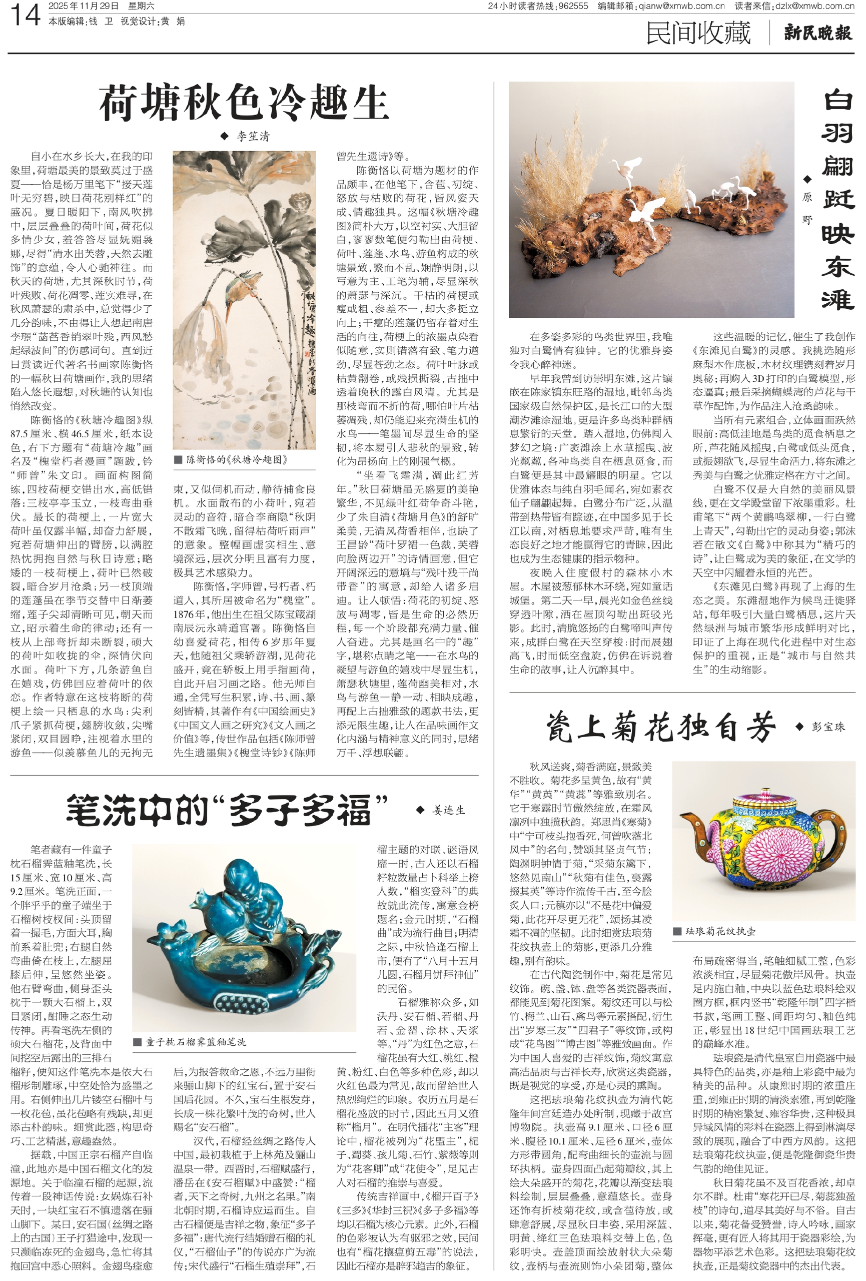 “坐看飞霜满,凋此红芳年。”秋日荷塘虽无盛夏的美艳繁华,不见绿叶红荷争奇斗艳,少了朱自清《荷塘月色》的舒旷柔美,无清风荷香相伴,也缺了王昌龄“荷叶罗裙一色裁,芙蓉向脸两边开”的诗情画意,但它开阔深远的意境与“残叶残干尚带香”的寓意,却给人诸多启迪。让人顿悟:荷花的初绽、怒放与凋零,皆是生命的必然历程,每一个阶段都充满力量、催人奋进。尤其是画名中的“趣”字,堪称点睛之笔——在水鸟的凝望与游鱼的嬉戏中尽显生机,萧瑟秋塘里,莲荷幽美相对,水鸟与游鱼一静一动、相映成趣,再配上古拙雅致的题款书法,更添无限生趣,让人在品味画作文化内涵与精神意义的同时,思绪万千、浮想联翩。