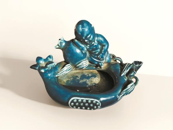 笔者藏有一件童子枕石榴霁蓝釉笔洗,长15厘米、宽10厘米、高9.2厘米。笔洗正面,一个胖乎乎的童子端坐于石榴树枝杈间:头顶留着一撮毛,方面大耳,胸前系着肚兜;右腿自然弯曲倚在枝上,左腿屈膝后伸,呈悠然坐姿。他右臂弯曲,侧身歪头枕于一颗大石榴上,双目紧闭,酣睡之态生动传神。再看笔洗左侧的硕大石榴花,及背面中间挖空后露出的三排石榴籽,便知这件笔洗本是依大石榴形制雕琢,中空处恰为盛墨之用。右侧伸出几片镂空石榴叶与一枚花苞,虽花苞略有残缺,却更添古朴韵味。细赏此器,构思奇巧、工艺精湛,意趣盎然。