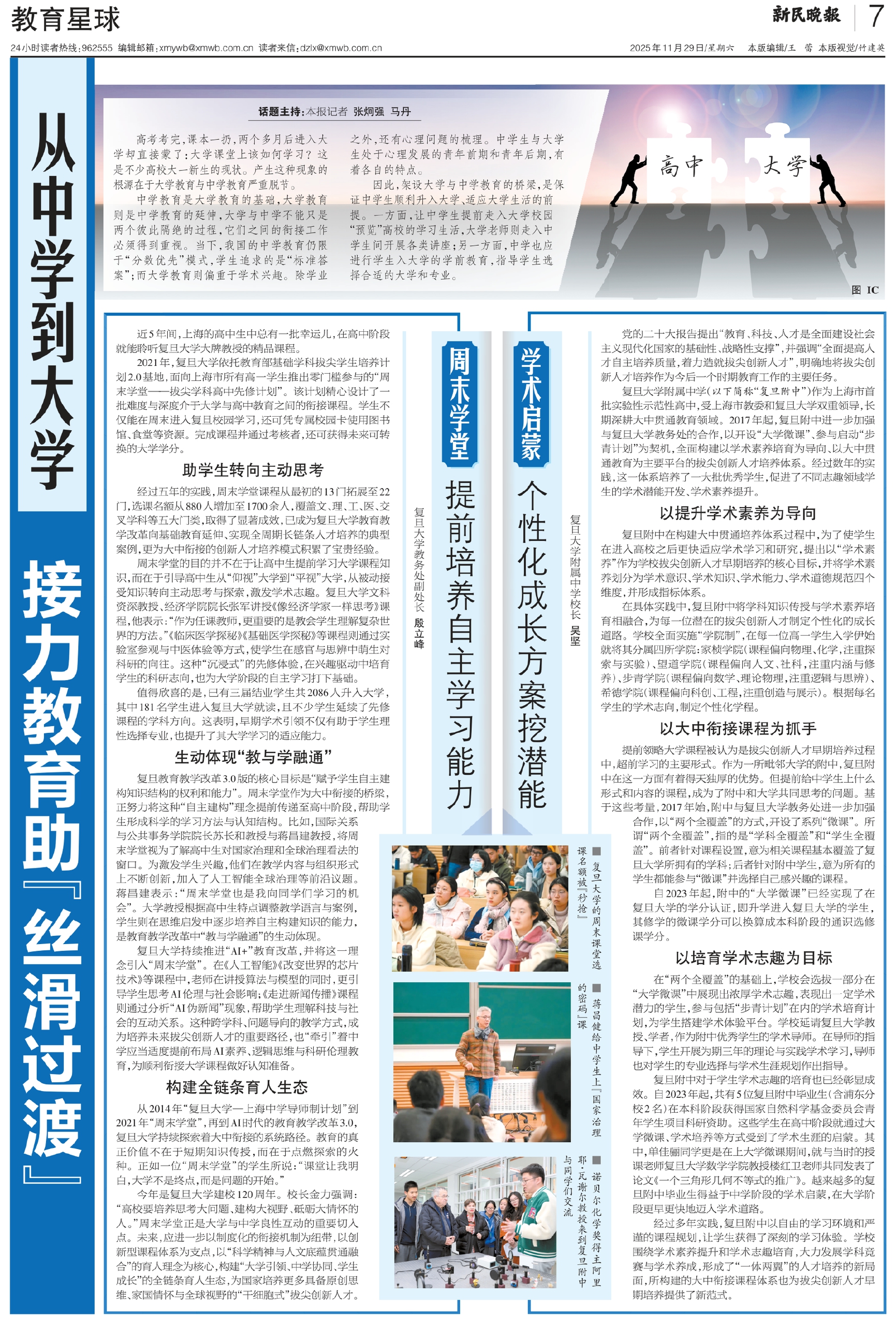 从2014年“复旦大学—上海中学导师制计划”到2021年“周末学堂”,再到AI时代的教育教学改革3.0,复旦大学持续探索着大中衔接的系统路径。教育的真正价值不在于短期知识传授,而在于点燃探索的火种。正如一位“周末学堂”的学生所说:“课堂让我明白,大学不是终点,而是问题的开始。”