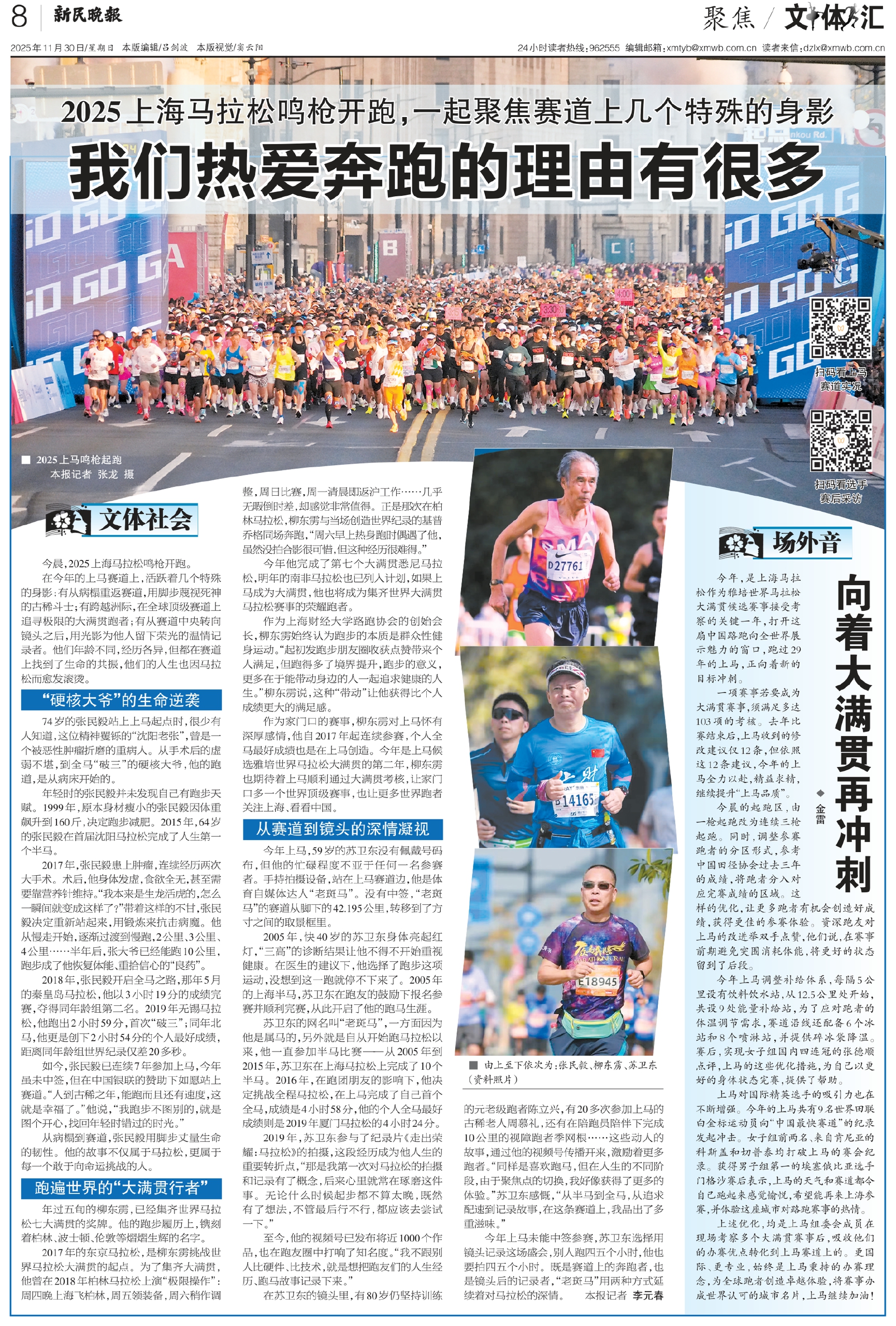 在苏卫东的镜头里,有80岁仍坚持训练的元老级跑者陈立兴,有20多次参加上马的古稀老人周慕礼,还有在陪跑员陪伴下完成10公里的视障跑者季网根……这些动人的故事,通过他的视频号传播开来,激励着更多跑者。“同样是喜欢跑马,但在人生的不同阶段,由于聚焦点的切换,我好像获得了更多的体验。”苏卫东感慨,“从半马到全马,从追求配速到记录故事,在这条赛道上,我品出了多重滋味。”