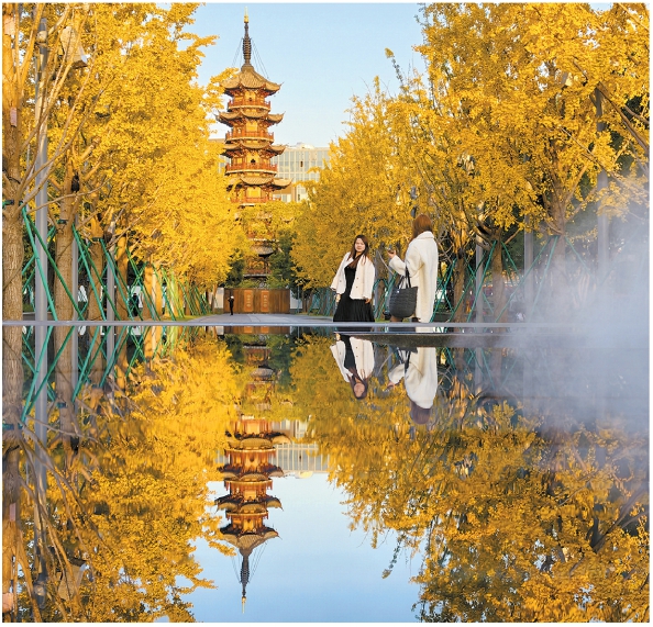 近日,申城银杏树慢慢披上了金色“秋装”。在阳光的照射下,龙华银杏大道的两排银杏树格外明艳。金黄的银杏与蓝天、水雾还有倒影,构成一幅美图,吸引不少市民游客来此打卡。 本报记者 周馨 摄影报道 >>>详见第9版