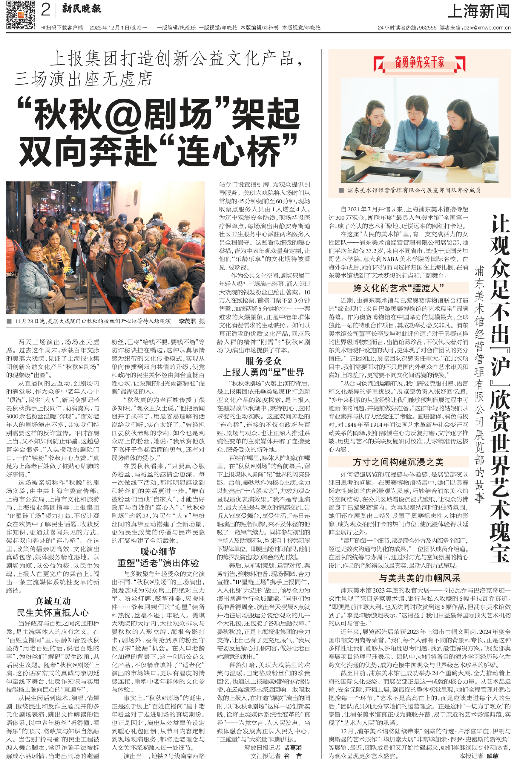 幕落灯暗,美琪大戏院里的欢笑与温暖,已定格成粉丝们的珍贵回忆,也通过上报融媒矩阵的持续传播,在云端激荡出深远回响。敢闯敢做的上报人,在打造“爆款”演出的同时,以“秋秋@剧场”这样一场创新实践,诠释主流媒体系统性变革的“真经”——为党立言,为人民发声。当媒体融合发展真正以人民为中心,“正能量”与“大流量”同频共振。