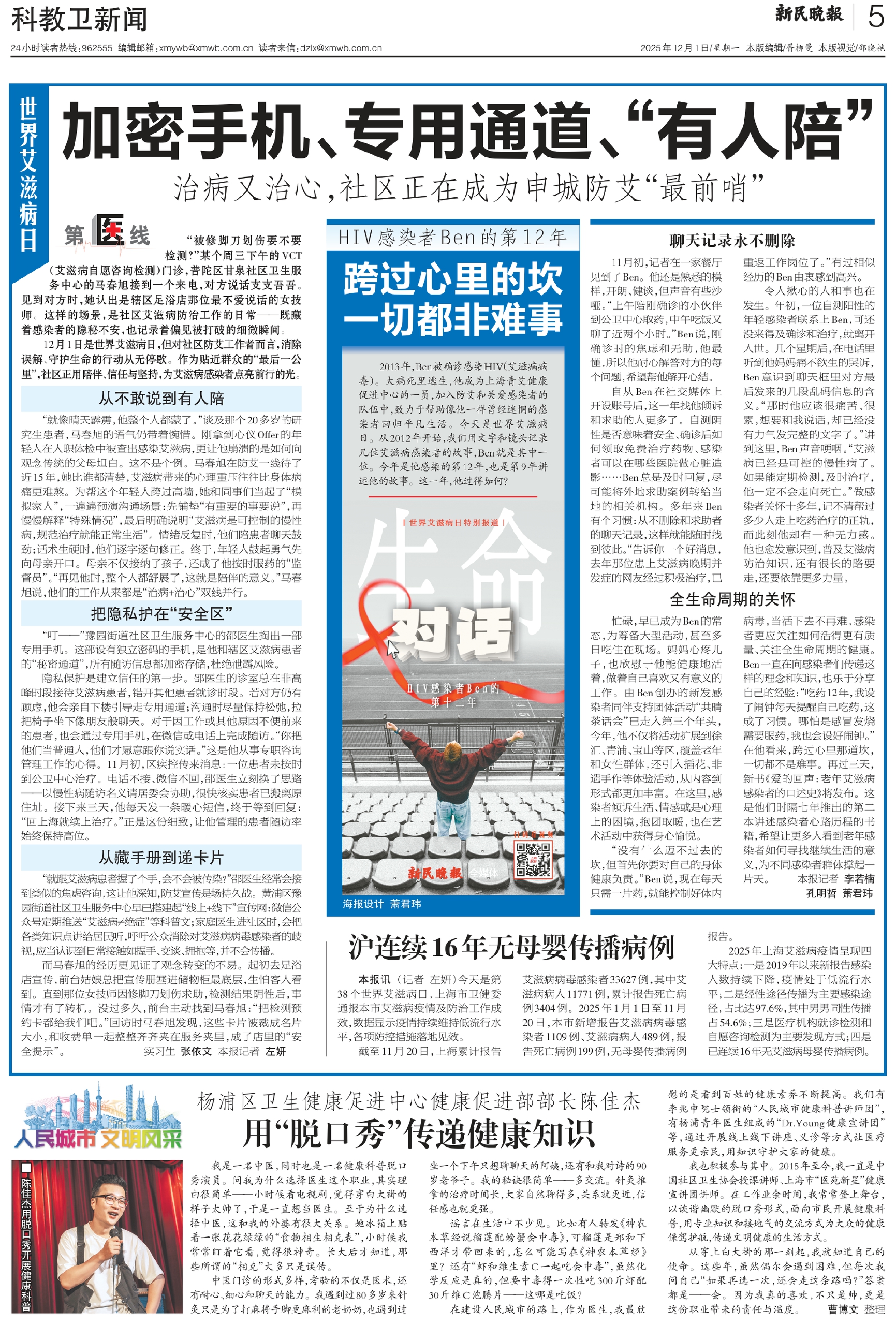 隐私保护是建立信任的第一步。邵医生的诊室总在非高峰时段接待艾滋病患者,错开其他患者就诊时段。若对方仍有顾虑,他会亲自下楼引导走专用通道;沟通时尽量保持松弛,拉把椅子坐下像朋友般聊天。对于因工作或其他原因不便前来的患者,也会通过专用手机,在微信或电话上完成随访。“你把他们当普通人,他们才愿意跟你说实话。”这是他从事专职咨询管理工作的心得。11月初,区疾控传来消息:一位患者未按时到公卫中心治疗。电话不接、微信不回,邵医生立刻换了思路——以慢性病随访名义请居委会协助,很快核实患者已搬离原住址。接下来三天,他每天发一条暖心短信,终于等到回复:“回上海就续上治疗。”正是这份细致,让他管理的患者随访率始终保持高位。