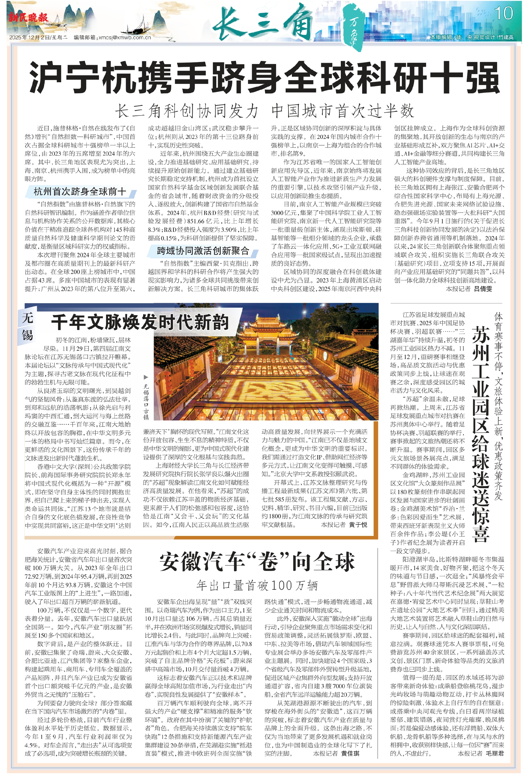 “自然指数”主编西蒙·贝克指出,跨越国界和学科的科研合作将产生强大的现实影响力,为诸多全球共同挑战带来创新解决方案。长三角科研城市的集体跃升,正是区域协同创新的深厚积淀与具体实践的支撑。在2024年国内城市合作十强榜单上,以南京—上海为组合的合作城市,排名第9。