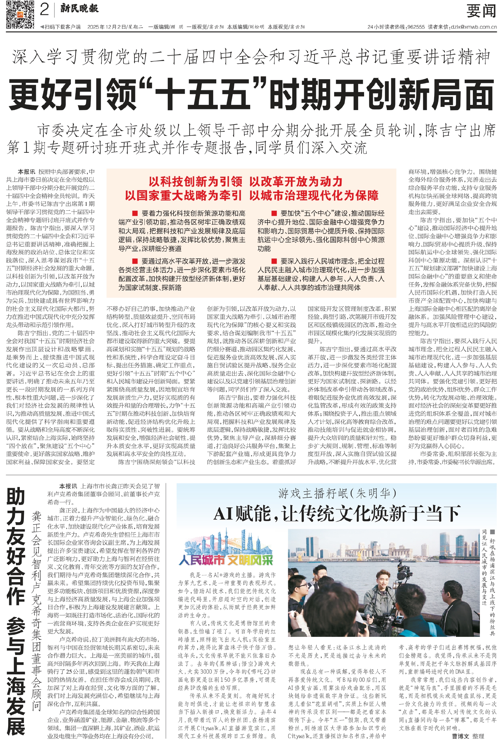 陈吉宁指出,党的二十届四中全会对我国“十五五”时期经济社会发展作出顶层设计和战略擘画,是乘势而上、接续推进中国式现代化建设的又一次总动员、总部署。习近平总书记在全会上的重要讲话,明确了推动未来五年乃至更长一段时期发展的一系列方向性、根本性重大问题,进一步深化了我们对经济社会发展的规律性认识,为推动高质量发展、推进中国式现代化提供了科学指南和重要遵循。要从战略和全局高度不断深化认识,紧密结合上海实际,始终坚持“四个放在”,聚焦建设“五个中心”重要使命,更好落实国家战略、维护国家利益、保障国家安全。要坚定不移办好自己的事,加快推动产业结构转型、质量效益提升、空间布局优化,深入打好城市转型升级的攻坚战,推动社会主义现代化国际大都市建设取得新的重大突破。要提高谋划和实施“十五五”规划的战略性和系统性,科学合理设定奋斗目标、提出任务措施、确定工作重点,更好引领“十五五”时期“五个中心”和人民城市建设开创新局面。要紧紧围绕高质量发展,因地制宜培育发展新质生产力,更好实现质的有效提升和量的合理增长,力争“十五五”时期在推动科技创新、加快培育新动能、促进经济结构优化升级上取得实质性、突破性进展。要统筹发展和安全,增强经济社会韧性,提升本质安全水平,更好实现高质量发展和高水平安全的良性互动。
