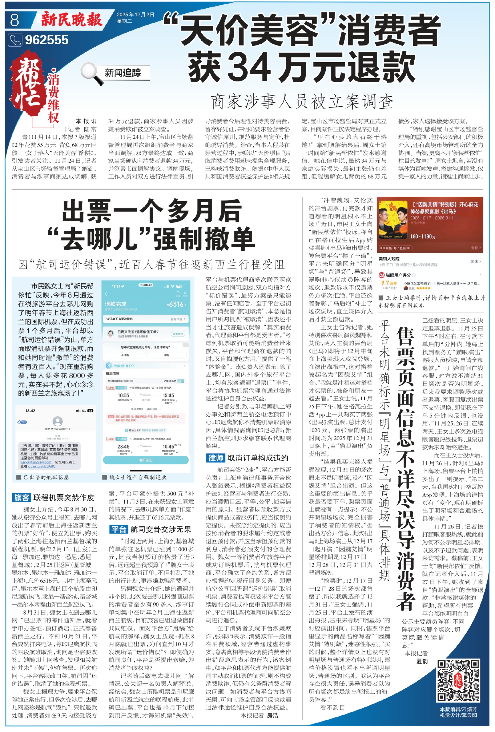 “天价美容”消费者获34万元退款 售票页面信息不详尽误导消费者 出票一个多月后 “去哪儿”强制撤单
