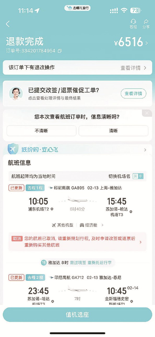 魏女士介绍,今年8月30日,她从旅游公众号上得知,去哪儿网放出了春节前后上海往返新西兰的机票“好价”,便立刻出手,购买了两张上海往返新西兰基督城的联程机票,明年2月13日出发(上海—雅加达、雅加达—悉尼、悉尼—基督城),2月25日返回(基督城—墨尔本、墨尔本—雅加达、雅加达—上海),总价6516元。其中上海至悉尼、墨尔本至上海的四个航段由印尼鹰航执飞,悉尼—基督城、基督城—墨尔本两程由新西兰航空执飞。