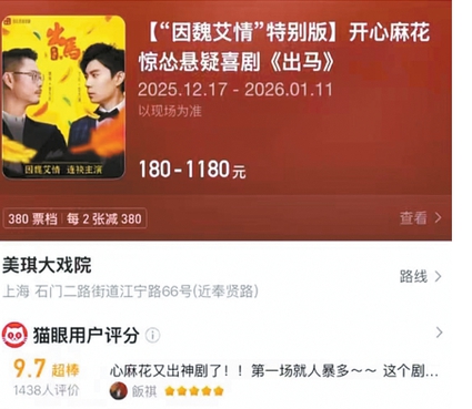 王女士告诉记者,她特别喜欢喜剧演员魏翔和艾伦,两人主演的舞台剧《出马》即将于12月中旬在上海美琪大戏院登场,在演出海报中,这对搭档被起名为“因魏艾情”组合。“我就是冲着这对搭档才买票的,准备和朋友一起去看。”王女士说,11月25日下午,她在格瓦拉生活App上一共购买了两张《出马》演出票,总计支付1020元。两张票的演出时间均为2025年12月31日晚上,由“猫眼演出”负责出票。