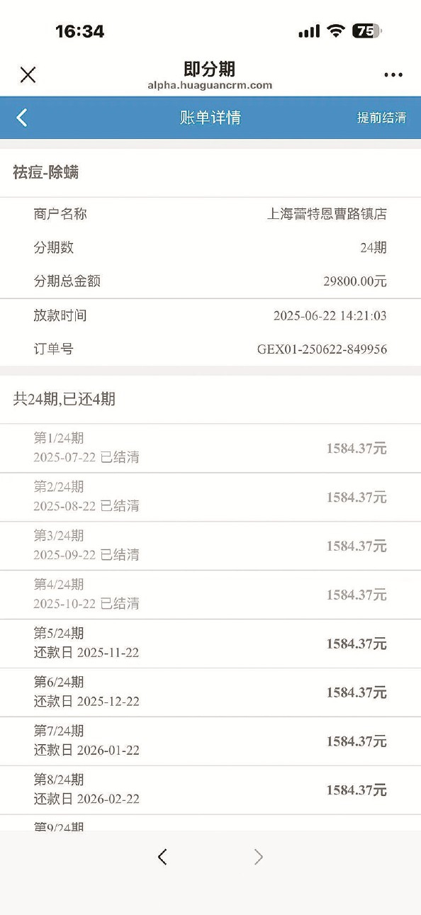 “他们说反正已经有分期了,29800元分24期,每月只多付几百块。”小周说,当时她已对店员建立了一定信任,又被“当场办理才有优惠”的说法打动,最终同意办理。6月22日,唐镇店店员将她带到同一老板旗下的蕾特恩美容曹路分店,由店长全程操作她的手机办理分期,“只说是分期,压根没告诉我是第三方贷款,也没说要付高额利息”。