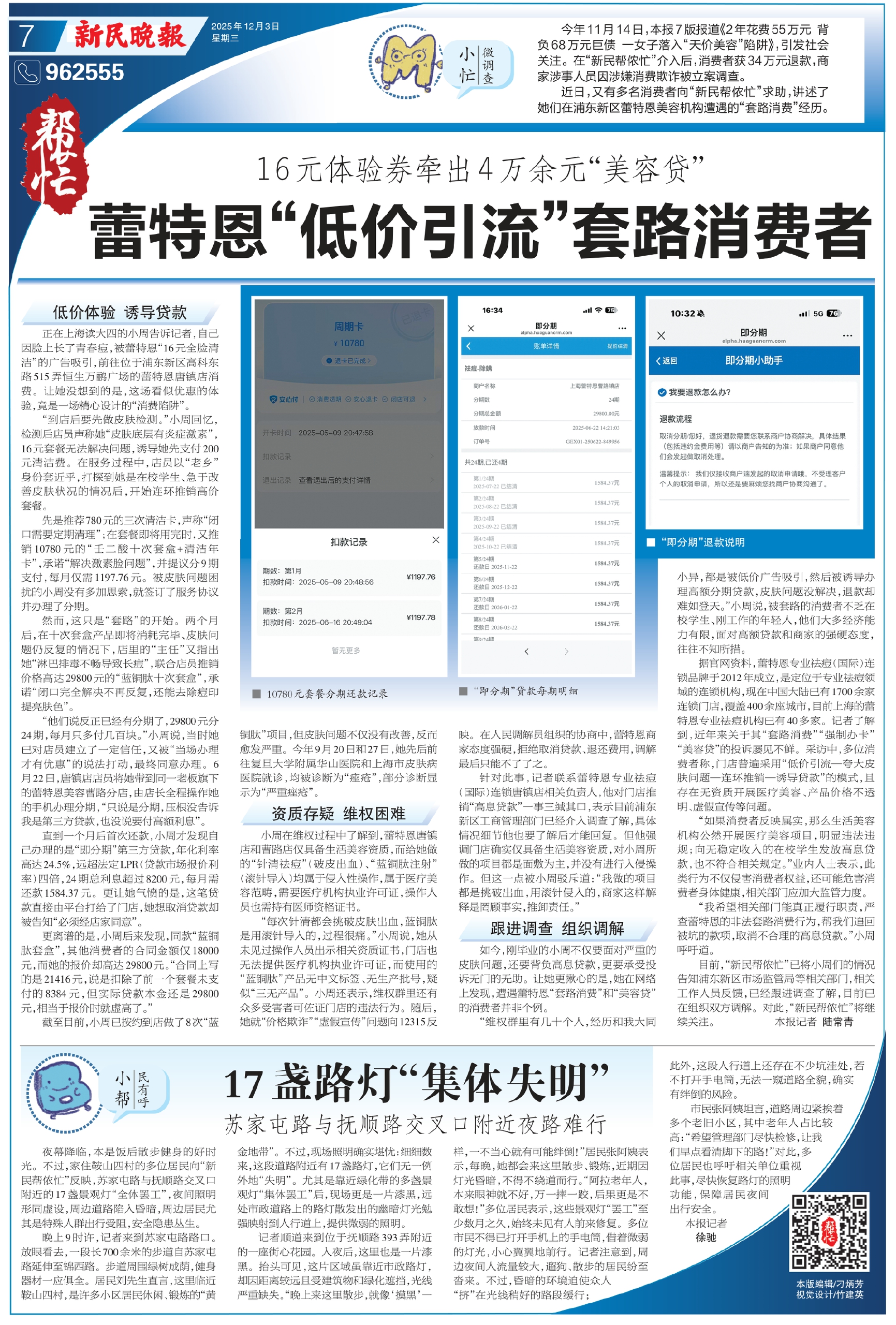 今年11月14日,本报7版报道《2年花费55万元 背负68万元巨债 一女子落入“天价美容”陷阱》,引发社会关注。在“新民帮侬忙”介入后,消费者获34万元退款,商家涉事人员因涉嫌消费欺诈被立案调查。