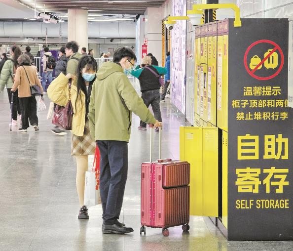 今天上午,在轨交人民广场站站厅,旅客将行李寄存到自助寄存柜内 本报记者 张龙 摄