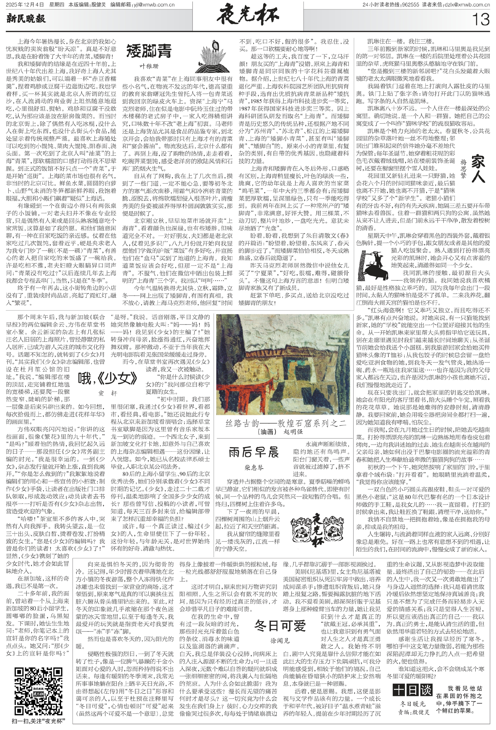 我和矮脚青的结缘是在近四十年前,上世纪八十年代出差上海,我好奇上海人尤其是秀美的姑娘们,可以端着一杯“赤豆香糯羹”,捏着鸡胗或豆腐干边逛街边吃,我也学着样,买一杯其实就是北京人所谓的红豆沙,在人流涌动的商业街上坦然随意地逛吃,心里很舒坦、熨帖。鸡胗和豆腐干没敢吃,认为那应该是放在厨房做菜的。而当时的北京街上,除了偶然有人吃冰棍,没什么人在街上吃东西,也没什么街头小食品,随处显示着传统规整严谨。最喜欢上海随处可以吃到的小馄饨、菜肉大馄饨、阳春面、浇头面。第一次吃到了北京人叫“油菜”的上海“青菜”,那软糯甜的口感打动得我不思荤腥。到正式的饭馆不好只点一个“青菜”,于是开始“巡街”。上海的菜市场也很有名气,非当时的北京可比。鲜鱼水菜,圆圆的白萝卜、山野气未消的冬笋都新鲜养眼,我饱着眼福,大胆和小贩们飙着“疑似”上海话。
