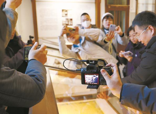 在辽宁大连旅顺博物馆,媒体工作者拍摄展出的“明谕琉球国王敕”(仿制品) 新华社 发