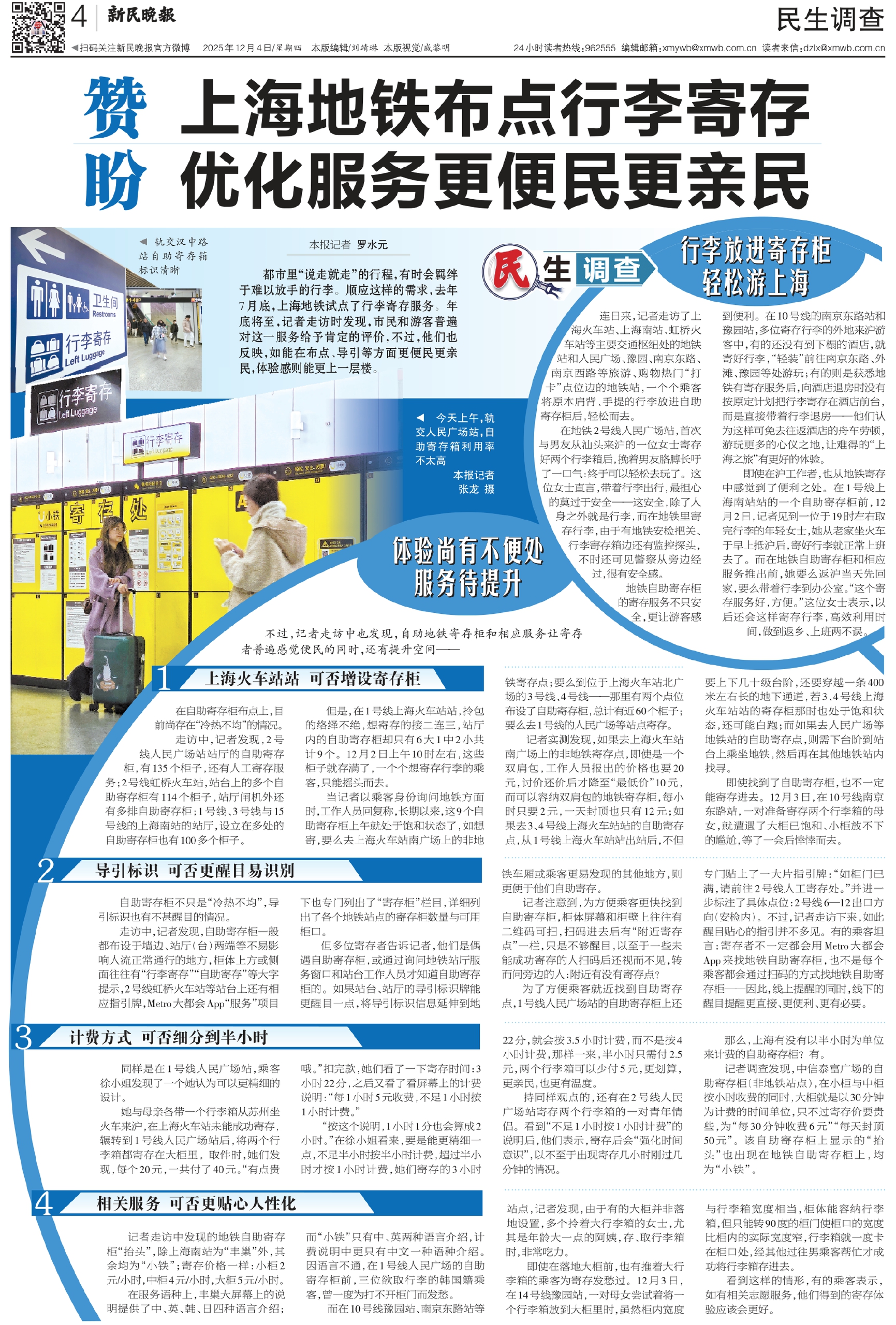 都市里“说走就走”的行程,有时会羁绊于难以放手的行李。顺应这样的需求,去年7月底,上海地铁试点了行李寄存服务。年底将至,记者走访时发现,市民和游客普遍对这一服务给予肯定的评价,不过,他们也反映,如能在布点、导引等方面更便民更亲民,体验感则能更上一层楼。