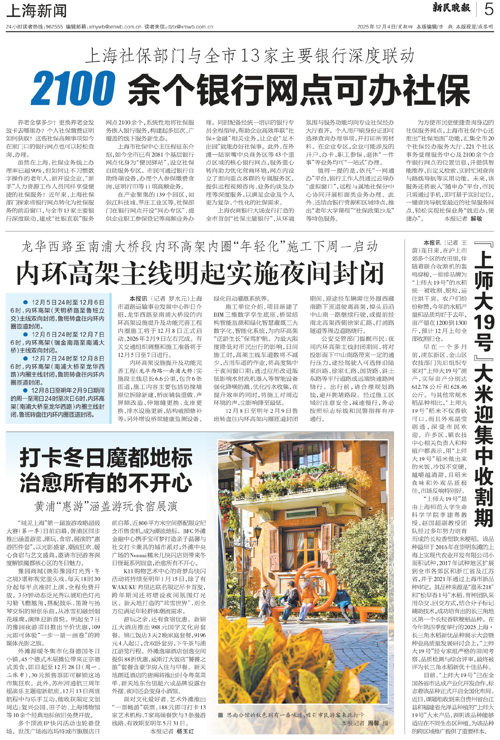 “上师大19号”大米迎集中收割期 内环高架主线明起实施夜间封闭 2100余个银行网点可办社保 打卡冬日魔都地标 治愈所有的不开心