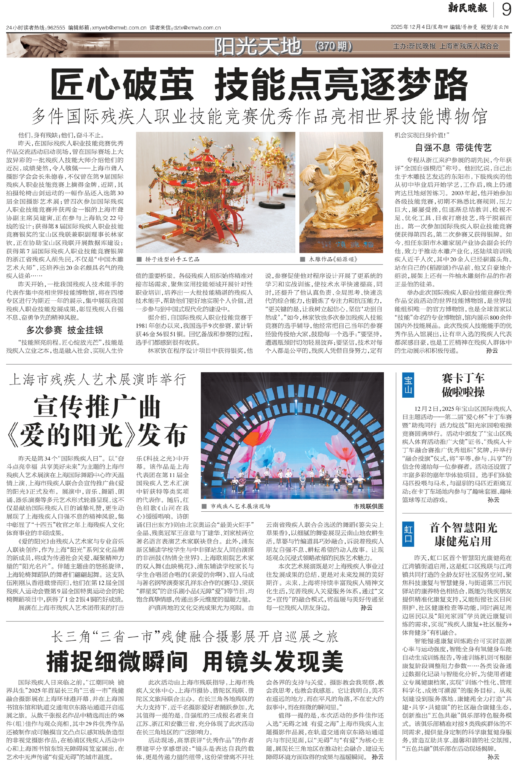 昨天,在国际残疾人职业技能竞赛优秀作品交流活动启动现场,曾在国际赛场上大放异彩的一批残疾人技能大师介绍他们的近况,成绩斐然,令人敬佩——上海市聋人摄影学会会长朱德春,不仅曾在第9届国际残疾人职业技能竞赛上摘得金牌,近期,其拍摄轮椅击剑运动的一幅作品还入选第30届全国摄影艺术展;曾四次参加国际残疾人职业技能竞赛并获两金一银的上海市聋协副主席吴建寅,正在参与上海轨交22号线的设计;获得第8届国际残疾人职业技能竞赛银奖的宝山区残联兼职副理事长林家钦,正在协助宝山区残联开展数据库建设;获得第7届国际残疾人职业技能竞赛银牌的浙江省残疾人胡先民,不仅是“中国木雕艺术大师”,还培养出20余名颇具名气的残疾人徒弟……
