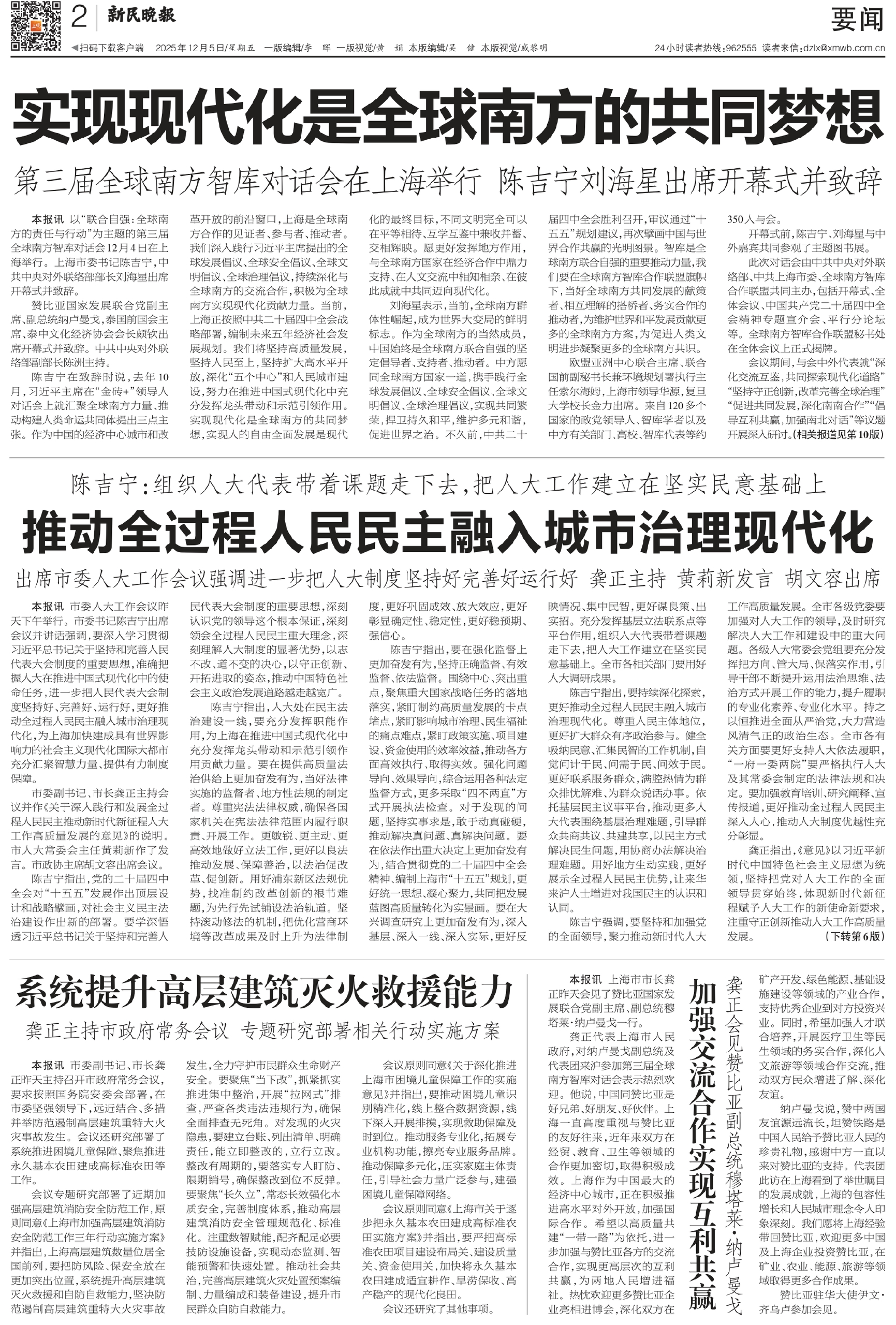 陈吉宁在致辞时说,去年10月,习近平主席在“金砖+”领导人对话会上就汇聚全球南方力量、推动构建人类命运共同体提出三点主张。作为中国的经济中心城市和改革开放的前沿窗口,上海是全球南方合作的见证者、参与者、推动者。我们深入践行习近平主席提出的全球发展倡议、全球安全倡议、全球文明倡议、全球治理倡议,持续深化与全球南方的交流合作,积极为全球南方实现现代化贡献力量。当前,上海正按照中共二十届四中全会战略部署,编制未来五年经济社会发展规划。我们将坚持高质量发展,坚持人民至上,坚持扩大高水平开放,深化“五个中心”和人民城市建设,努力在推进中国式现代化中充分发挥龙头带动和示范引领作用。实现现代化是全球南方的共同梦想,实现人的自由全面发展是现代化的最终目标,不同文明完全可以在平等相待、互学互鉴中兼收并蓄、交相辉映。愿更好发挥地方作用,与全球南方国家在经济合作中鼎力支持、在人文交流中相知相亲、在彼此成就中共同迈向现代化。