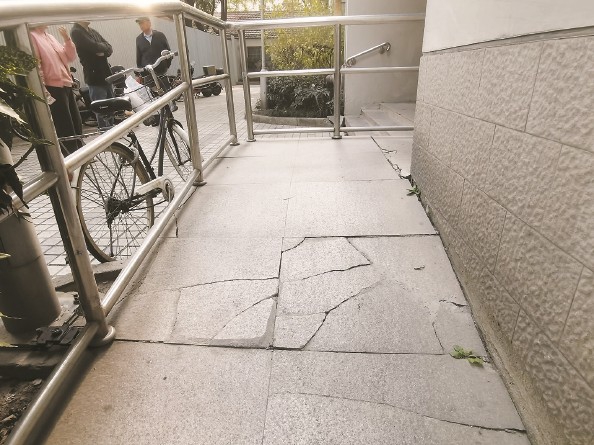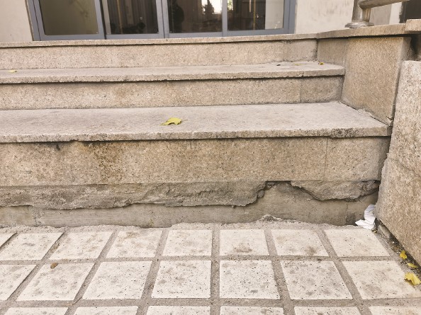 4号楼是出现沉降迹象最明显的一幢楼。记者看到,大楼门厅处有3级台阶,第一级台阶与地面接壤,出现明显的豁开裂缝,上下拉开了10—20厘米的落差。从肉眼可见的沉降痕迹来看,更可描述为路面沉降,从而大大抬高了第一级台阶的高度。两者之间的裂缝处,陈旧水泥斑块裸露。台阶旁边的无障碍通道,部分坡面不平,大理石贴面碎裂,坡面与墙面的衔接处也有沉降痕迹。无障碍斜坡通道的一处转角,有一个类似高台的过渡区(高度与3级台阶等高),侧面大理石碎裂、脱开,并出现了较大裂缝。