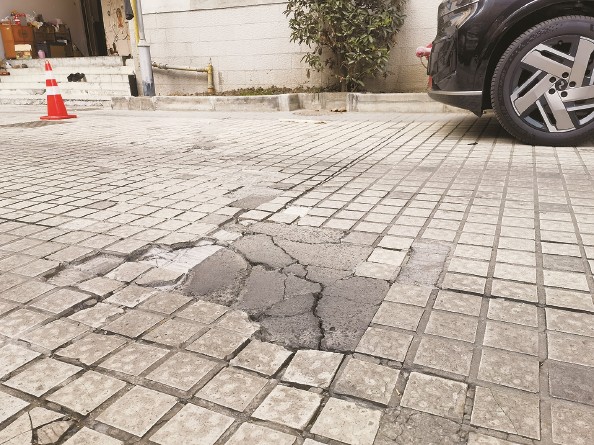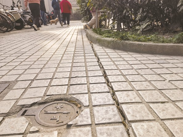 而在4号楼以外,多位居民还向记者通报了更多的沉降迹象:“2号楼外小斜坡也沉降了。”“康定路门口花坛,靠近铁门这侧,裂了1—2厘米。”“2号楼01室和02室间的楼梯间墙,新出现了斜裂缝,之前没有的。”还有多位2号楼居民反映,家中不同程度出现裂缝,且裂纹都是在距离4号楼较近的房间和卫生间出现的;4号楼和2号楼中间花园的池壁,从上到下裂开了一道贯穿缝;小区部分地砖路面也出现裂缝和不平。
