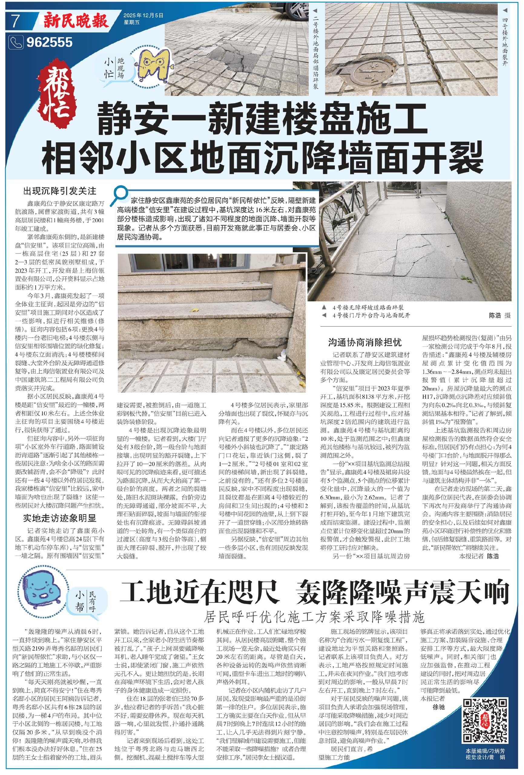 在记者走访现场的第二天,鑫康苑多位居民代表,在居委会协调下再次与开发商举行了沟通协商会。沟通内容主要围绕:消除居民的安全担心,以及后续如何对鑫康苑小区环境进行补偿性的优化和修缮,包括修复裂缝、重筑路面等。对此,“新民帮侬忙”将继续关注。