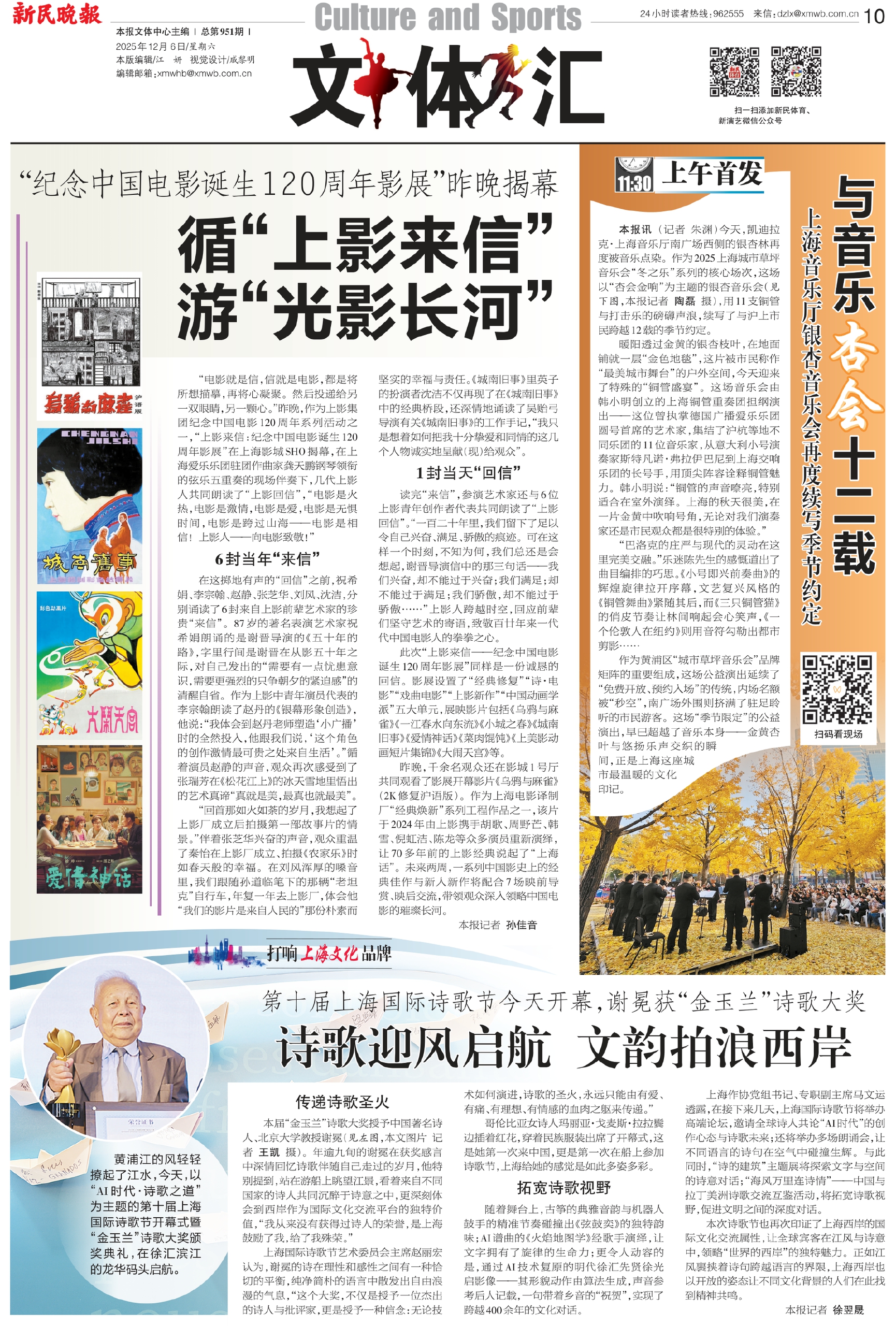 “电影就是信,信就是电影,都是将所想描摹,再将心凝聚。然后投递给另一双眼睛,另一颗心。”昨晚,作为上影集团纪念中国电影120周年系列活动之一,“上影来信:纪念中国电影诞生120周年影展”在上海影城SHO揭幕,在上海爱乐乐团驻团作曲家龚天鹏钢琴领衔的弦乐五重奏的现场伴奏下,几代上影人共同朗读了“上影回信”,“电影是火热,电影是激情,电影是爱,电影是无惧时间,电影是跨过山海——电影是相信!上影人——向电影致敬!”