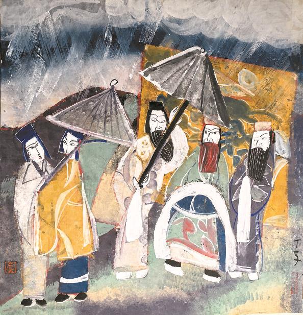 关良戏画的精髓在于“得意忘形”——以看似儿童画般稚拙的线条与造型,捕捉戏曲人物最本质的神态与动势,其背后是高度的形式提炼能力和不受拘束的心灵自由。丁立人从中领悟到的,正是一种挣脱学院派教条、直抵事物本真与情感核心的勇气和方法。他将关良从戏曲中提炼“神韵”的方式,扩展到了更广阔的民间艺术天地。他吸收关良的“稚拙”,但将其与自己热爱的剪纸、木版年画、泥塑乃至非洲雕刻的强烈视觉语言相结合,形成了一种更具民俗狂欢色彩和原始张力的个人风格。可以说,关良赋予了他“眼”与“胆”(观察的方法与创造的胆魄),而丁立人则用自己的“根”与“库”(民间艺术的根脉与素材库)给予了丰沛的回响。他继承了关良对“天真”与“幽默”的美学追求,并在当代语境下将其推向更极致的装饰性与叙事性。这份独特的师承,让丁立人成为连接关良所代表的现代戏画开创期与当代多元生态之间的重要桥梁。他曾说:“我看戏,看的不是故事,是那股子精神头和热闹劲儿。”这种剥离叙事、直取神韵的“热闹”,正是其作品跨越雅俗和时代,吸引当代观众的魅力所在——它原始、直接、充满生命张力。