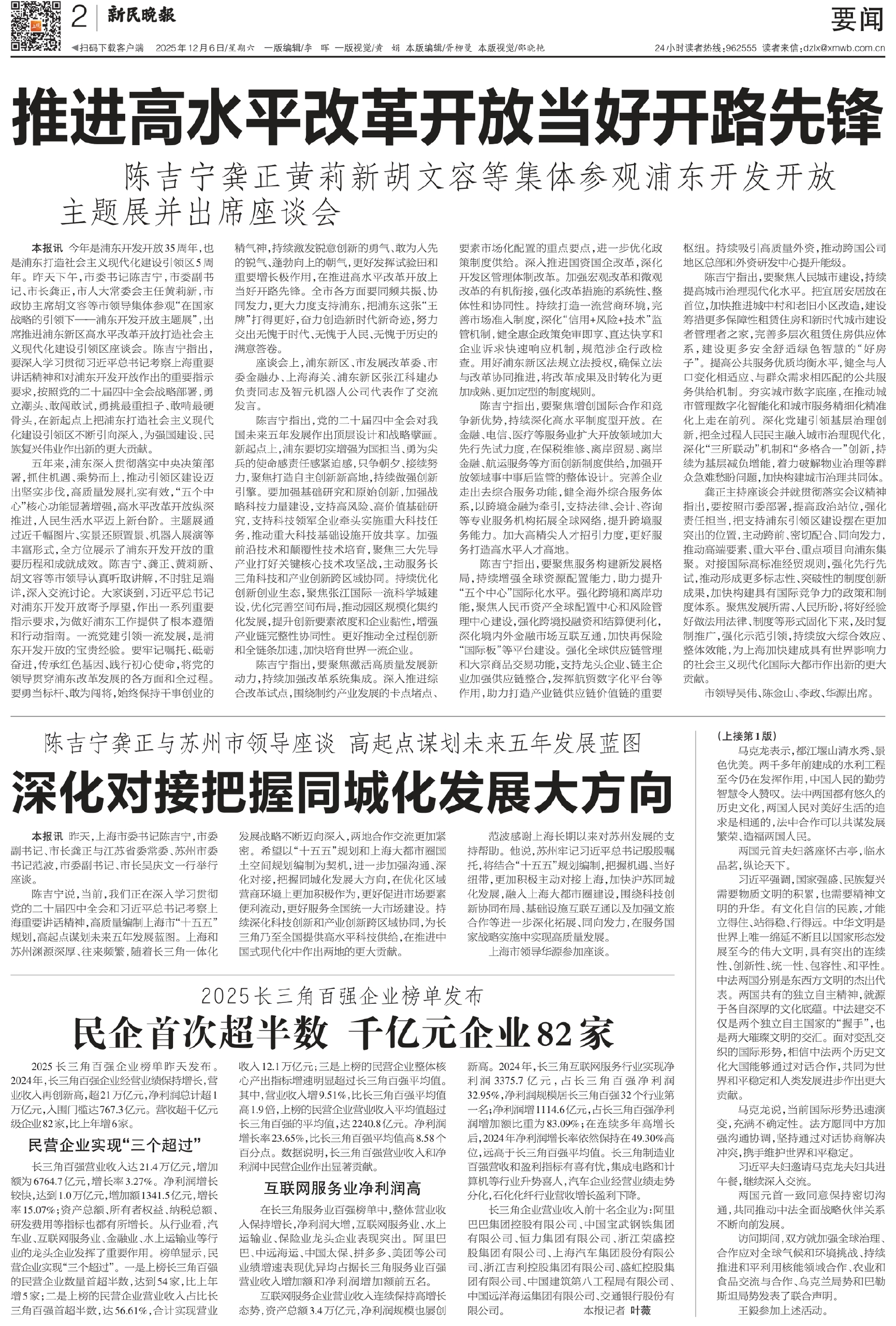 本报讯 今年是浦东开发开放35周年,也是浦东打造社会主义现代化建设引领区5周年。昨天下午,市委书记陈吉宁,市委副书记、市长龚正,市人大常委会主任黄莉新,市政协主席胡文容等市领导集体参观“在国家战略的引领下——浦东开发开放主题展”,出席推进浦东新区高水平改革开放打造社会主义现代化建设引领区座谈会。陈吉宁指出,要深入学习贯彻习近平总书记考察上海重要讲话精神和对浦东开发开放作出的重要指示要求,按照党的二十届四中全会战略部署,勇立潮头、敢闯敢试,勇挑最重担子、敢啃最硬骨头,在新起点上把浦东打造社会主义现代化建设引领区不断引向深入,为强国建设、民族复兴伟业作出新的更大贡献。