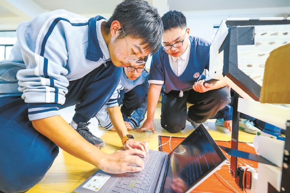 立达中学机器人兴趣组的学生学习编程知识及机器人组装与调试技巧 本报记者 陶磊 通讯员 蔡斌 摄