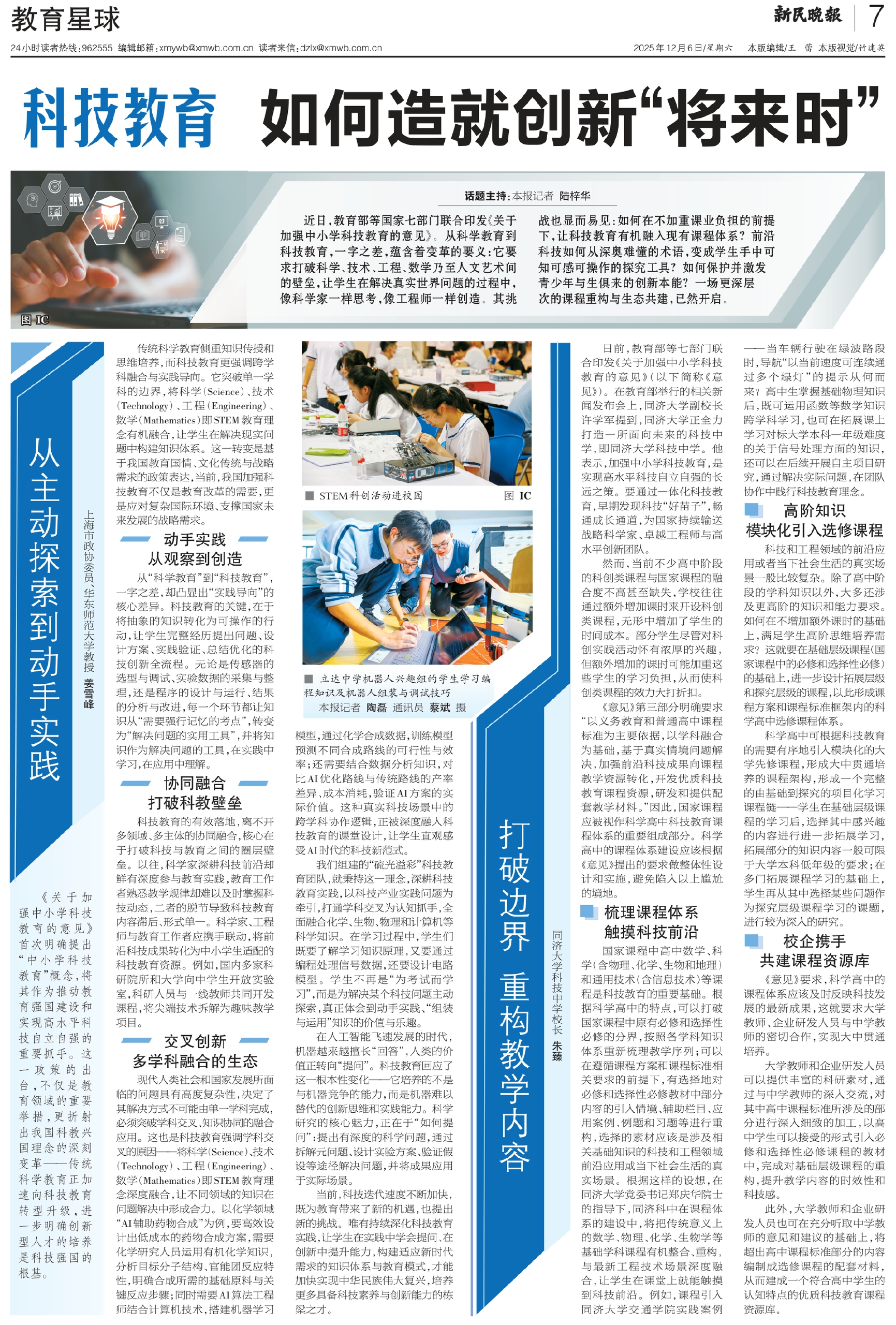 近日,教育部等国家七部门联合印发《关于加强中小学科技教育的意见》。从科学教育到科技教育,一字之差,蕴含着变革的要义:它要求打破科学、技术、工程、数学乃至人文艺术间的壁垒,让学生在解决真实世界问题的过程中,像科学家一样思考,像工程师一样创造。其挑战也显而易见:如何在不加重课业负担的前提下,让科技教育有机融入现有课程体系?前沿科技如何从深奥难懂的术语,变成学生手中可知可感可操作的探究工具?如何保护并激发青少年与生俱来的创新本能?一场更深层次的课程重构与生态共建,已然开启。