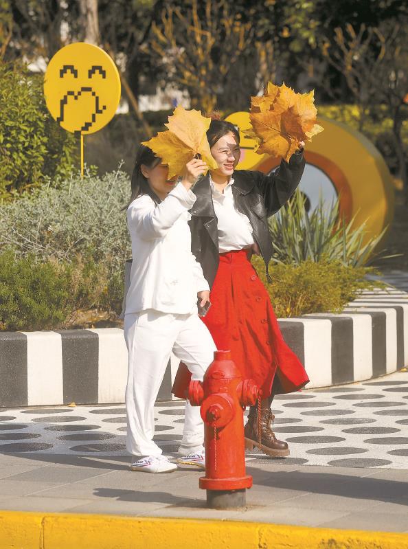 街头,两位路人巧妙地拿着梧桐叶遮挡阳光