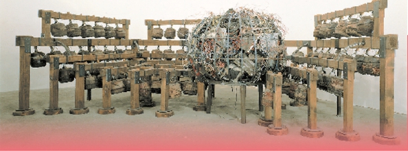 当我系统阅读陈箴的作品以及相关文献,获得的是一种超越性的震撼!陈箴的艺术生涯,大致可以分为上海时期(包括上戏六年学习工作)和远行海外艺术创作的高峰期。在这样两个不同时期不同文化的浸染下,经历了从油画到现代装置艺术的转换。理解陈箴的创作,从东方、西方二元视角进入是一个通道,但我觉得这样的理解和阐释有可能遮蔽其作品巨大的超越意义。他选择了装置艺术,显然是受到西方当代艺术的影响,但是这种影响仅仅是唤醒了艺术家内心潜藏的媒介意识,其巨大的创造性审美和惊人的揭示意蕴才是我们应该关注的。