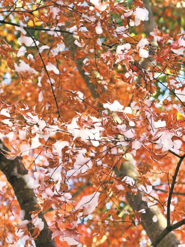 秋霞圃园里造雪机营造出红叶飘雪的美景