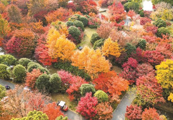 上海花开海上生态园2025枫叶季日前启幕,20余个品种的枫树渐次进入最佳观赏状态,秋景园与花海区域,鸡爪槭、美国红枫、挪威槭等枫树沿步道铺展,红、黄、绿三色叶片交织成斑斓画卷,构成多重诗意景致,为市民游客献上沉浸式秋日盛宴本报记者 陶磊 摄